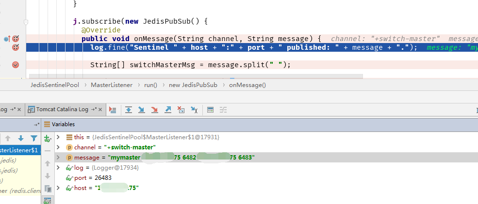 重点在步骤12中,MasterListener继承了Thread,它是个单独的线程,通过Jedis监听Redis的哨兵,如果收到master改变的消息,那么会修改JedisFactory。如下图3所示是MasterListener收到master节点变化的消息: