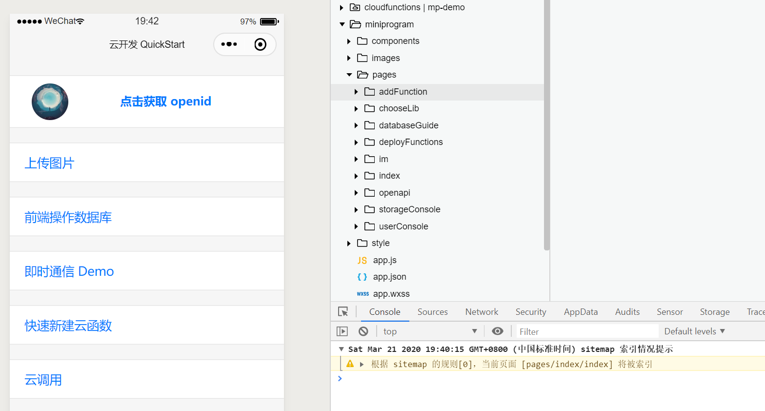 然后我们直接在onLoad里面直接去调用我们的云函数 ,用cloud.callFunction()的方式去调用云函数。