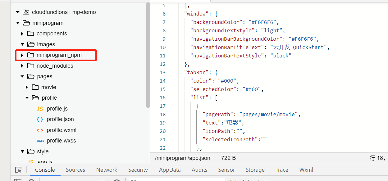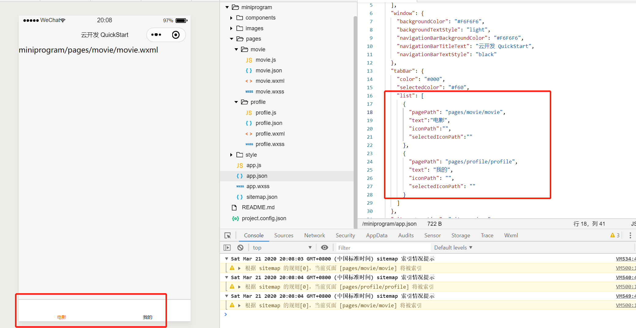 3. 创建自己的tab, 值得说的是app.json必须是严格的json格式,即要双引号,不能多余的, 号