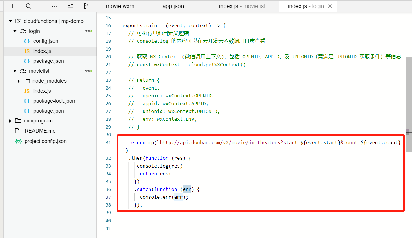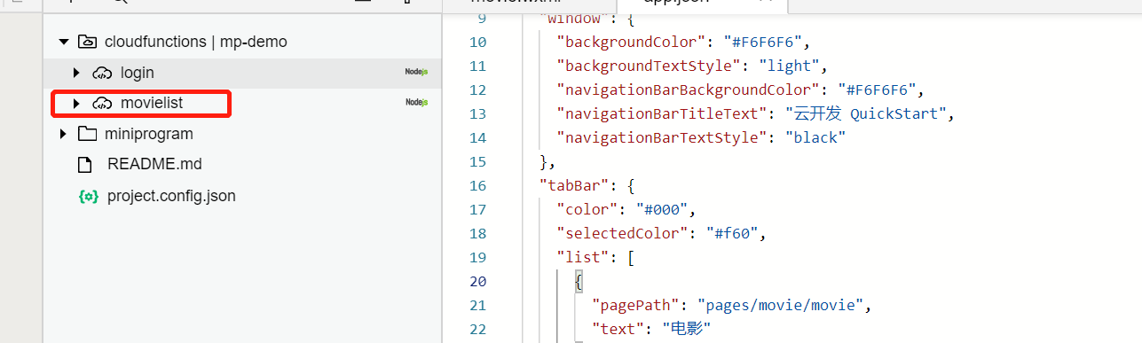 我们回到我们的电影主界面,movie目录,电机打开movies.js文件,在这个.js文件当中我们需要做的是当加载电影这个 界面的时候,我们就要去发送请求,也就是说,我需要去调用刚刚定义好的云函数 ,在movies.js当中定义了很多生命周期函数,也就是钩子函数。 这些钩子函数是会当生命周期到达这个阶段的时候会被自动的调用,那么我们直接在onLoad这个函数,这是一个监听页面加载函数,也就是页面加载的时候会自动去加载这个onLoad函数,