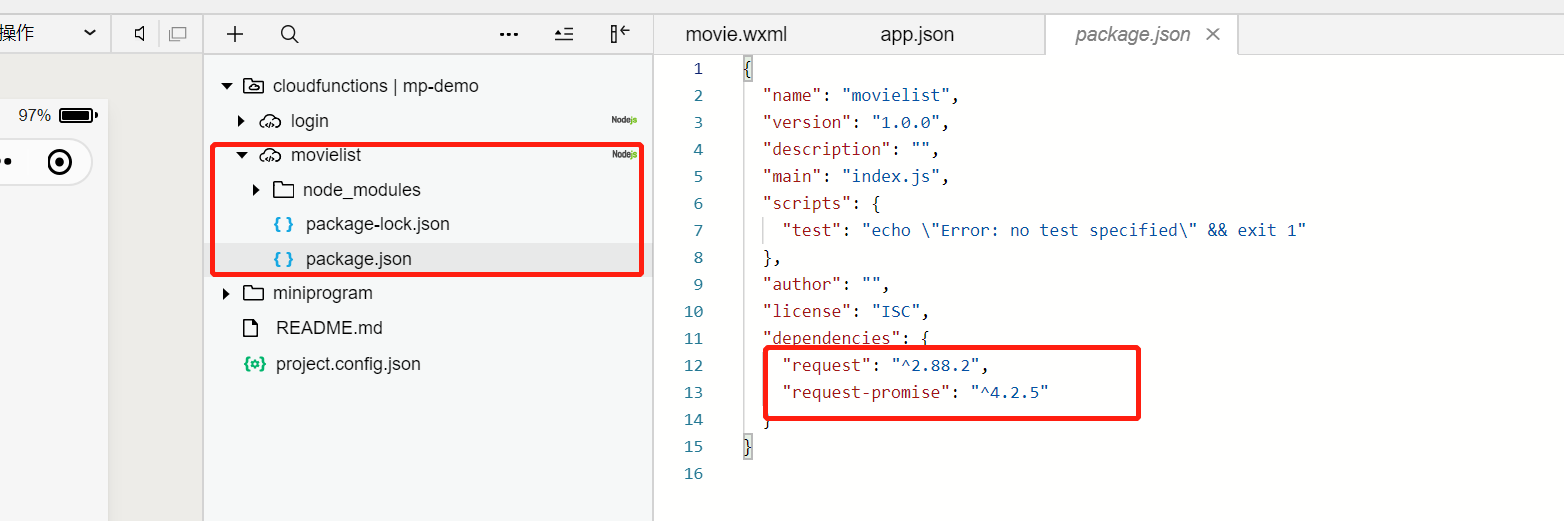 创建好了后,在movielist文件里 使用终端打开,在终端中输入第一条安装request的命令,安装完这个包后,就安装request -promise这个包,但是得记住,必须得先按照request这个包,然后再安装request-promise这个包。