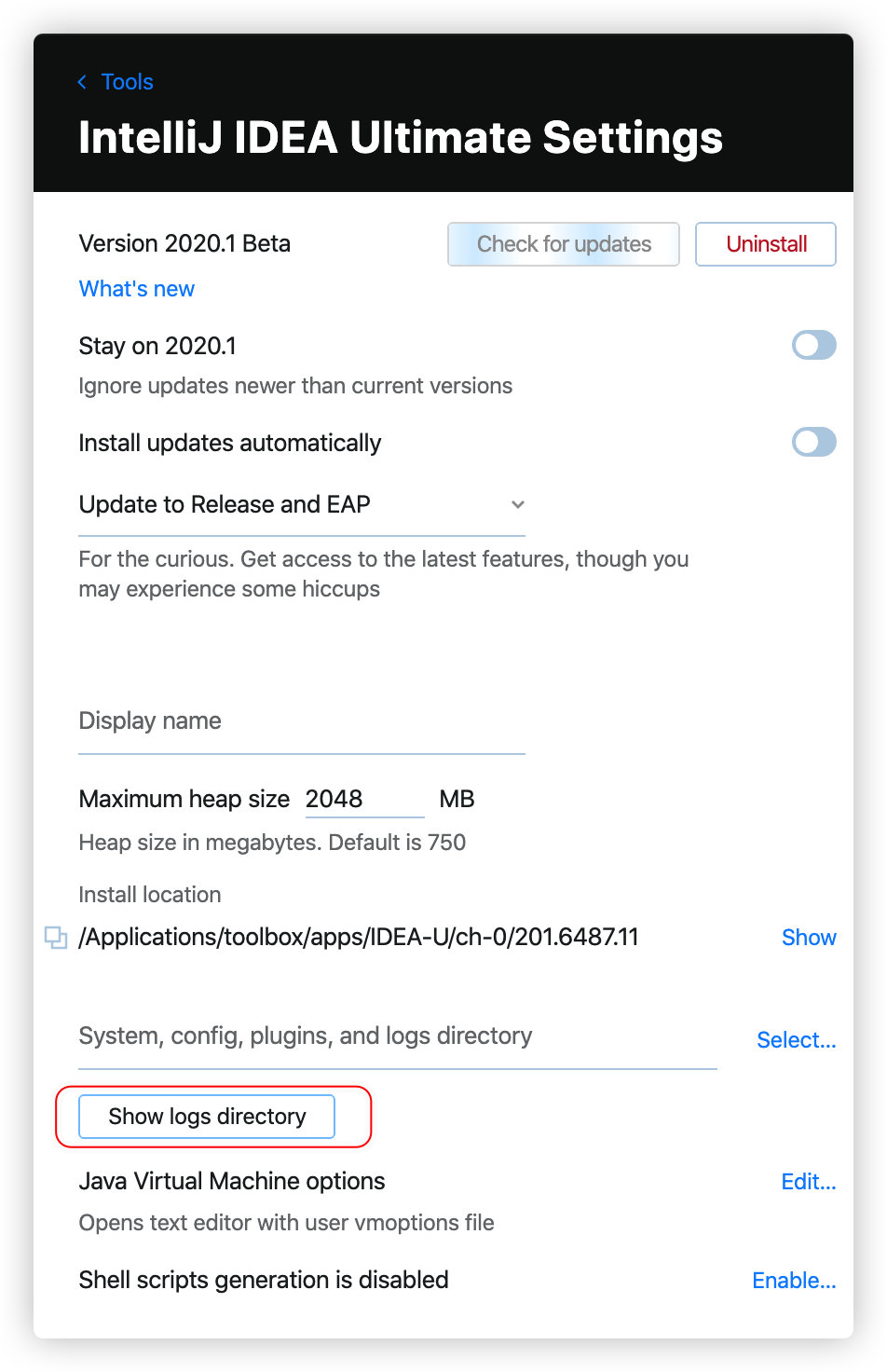 ~/Library/Logs/<product><version>