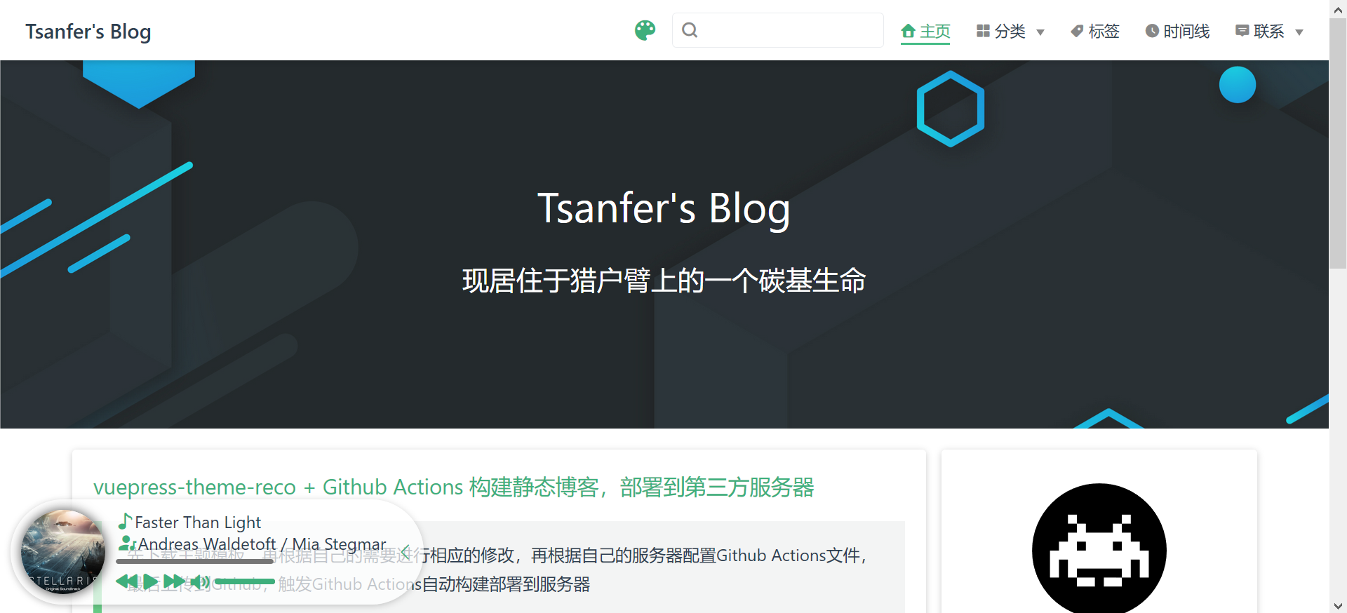 title: "Tsanfer's Blog", // 显示在左上角的网页名称以及首页在浏览器标签显示的title名称