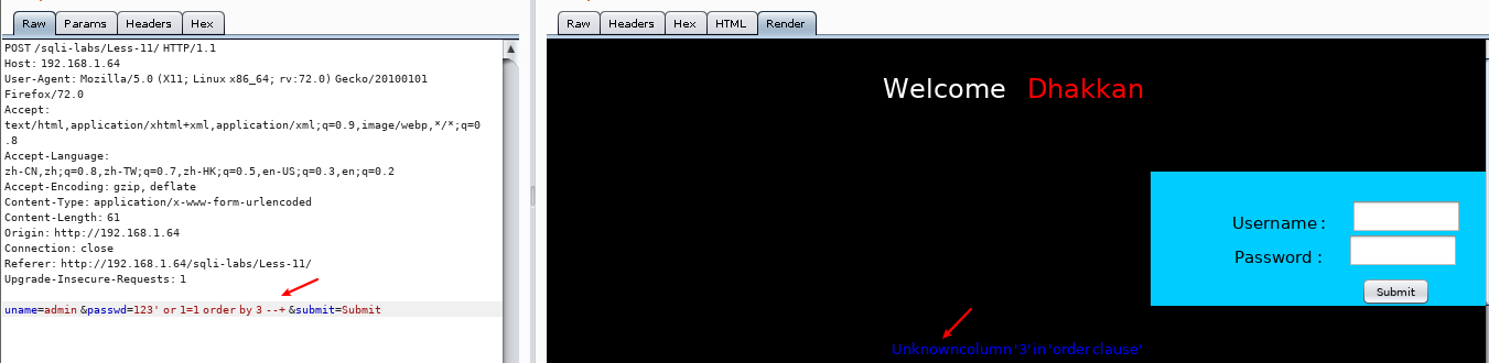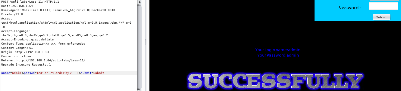 uname=admin &passwd=123' or 1=1 order by 2 --+ &submit=Submit