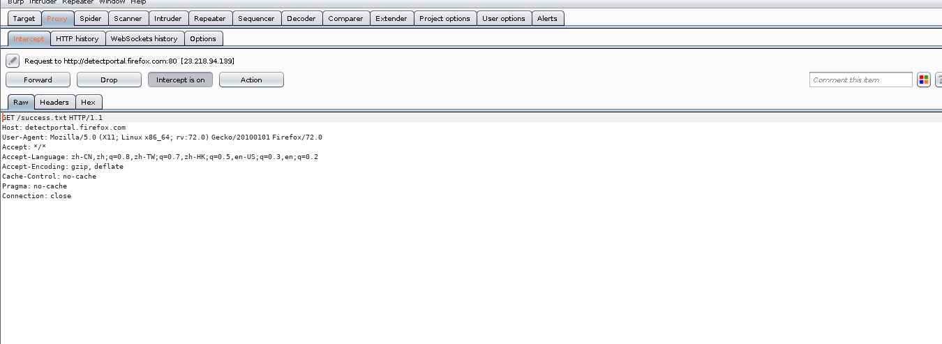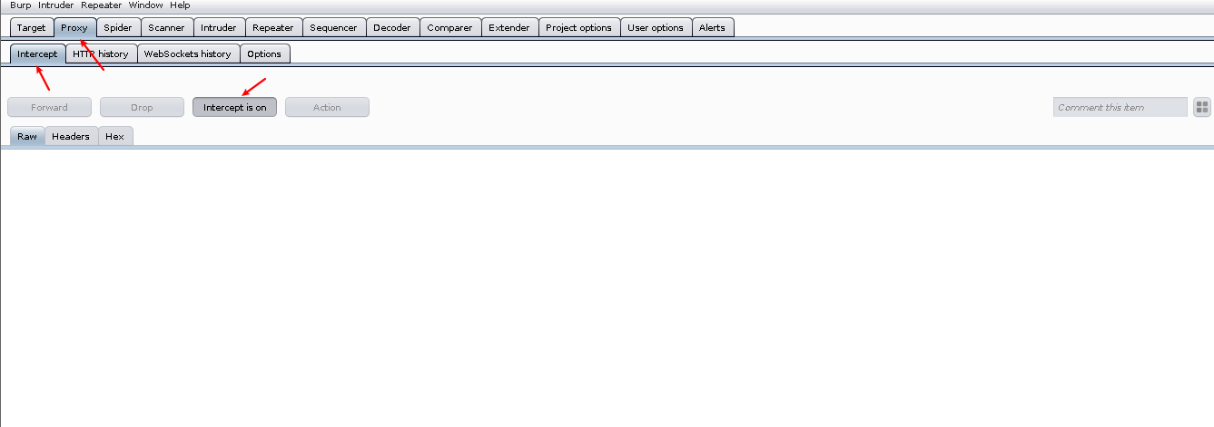 4、在BurpSuite界面中点击“Proxy”->“Intercept“,默认intercept功能是启动的。如果intercept is Off表示关闭,点击一下即可启动。