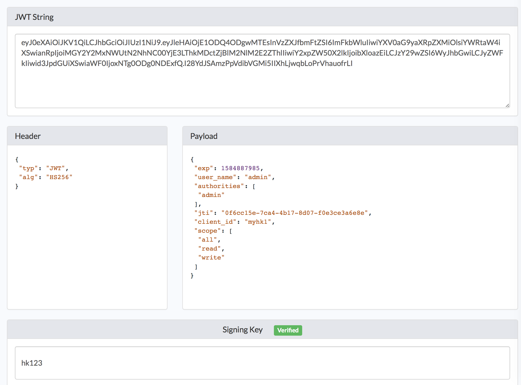 将access_token中的内容复制到https://www.jsonwebtoken.io网站解析下: