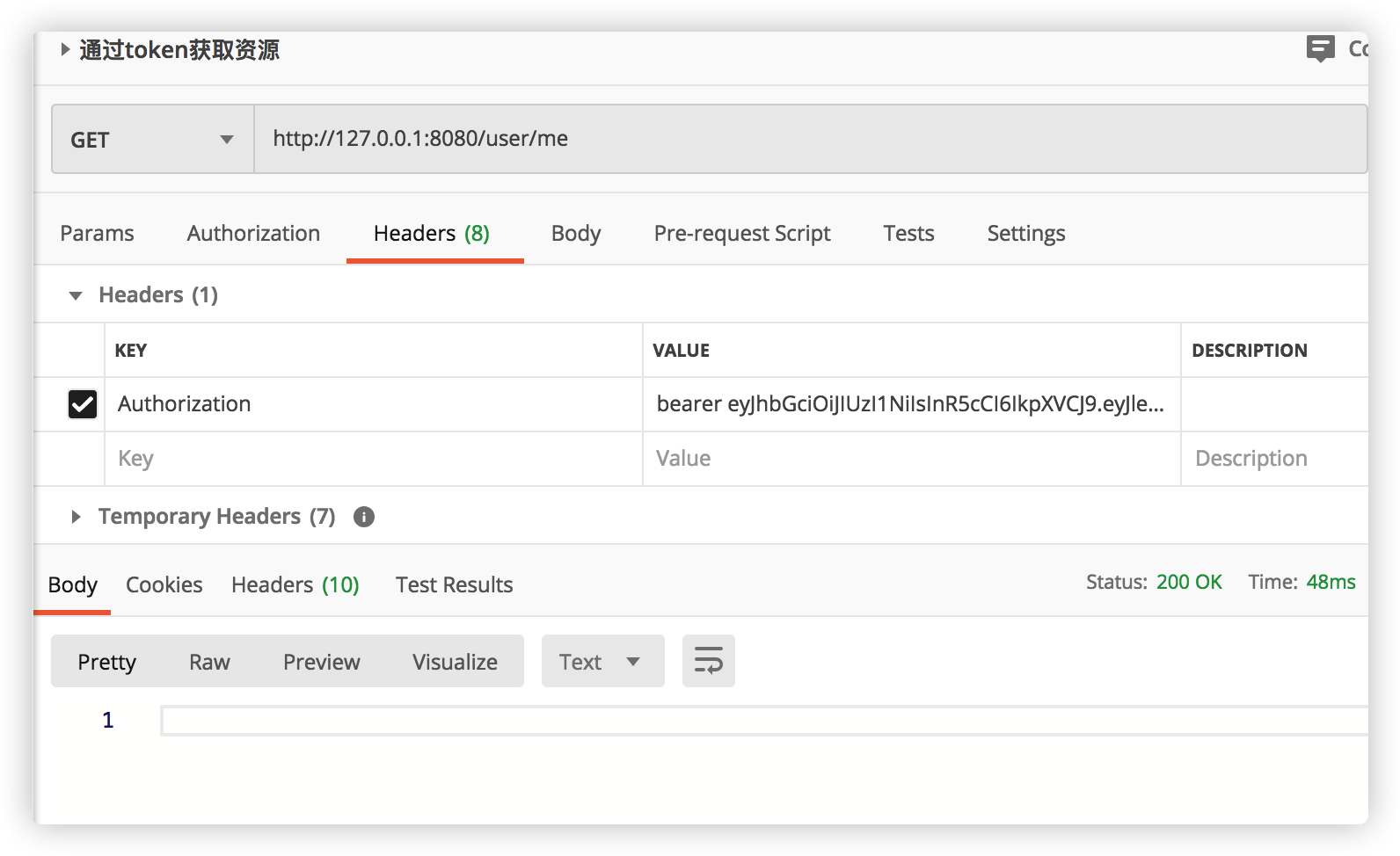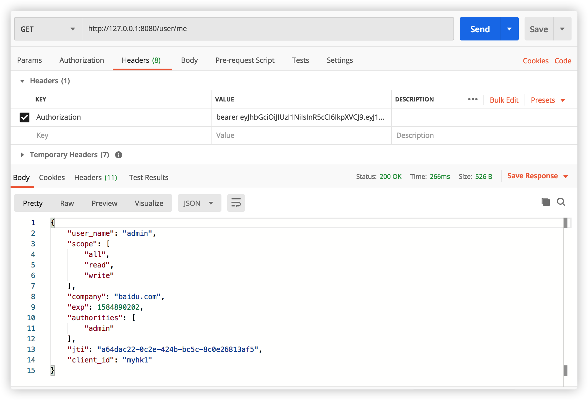 signkey需要和TokenStoreConfig中指定的签名密钥一致。重启项目,获取令牌后访问/user/me,输出内容如下: