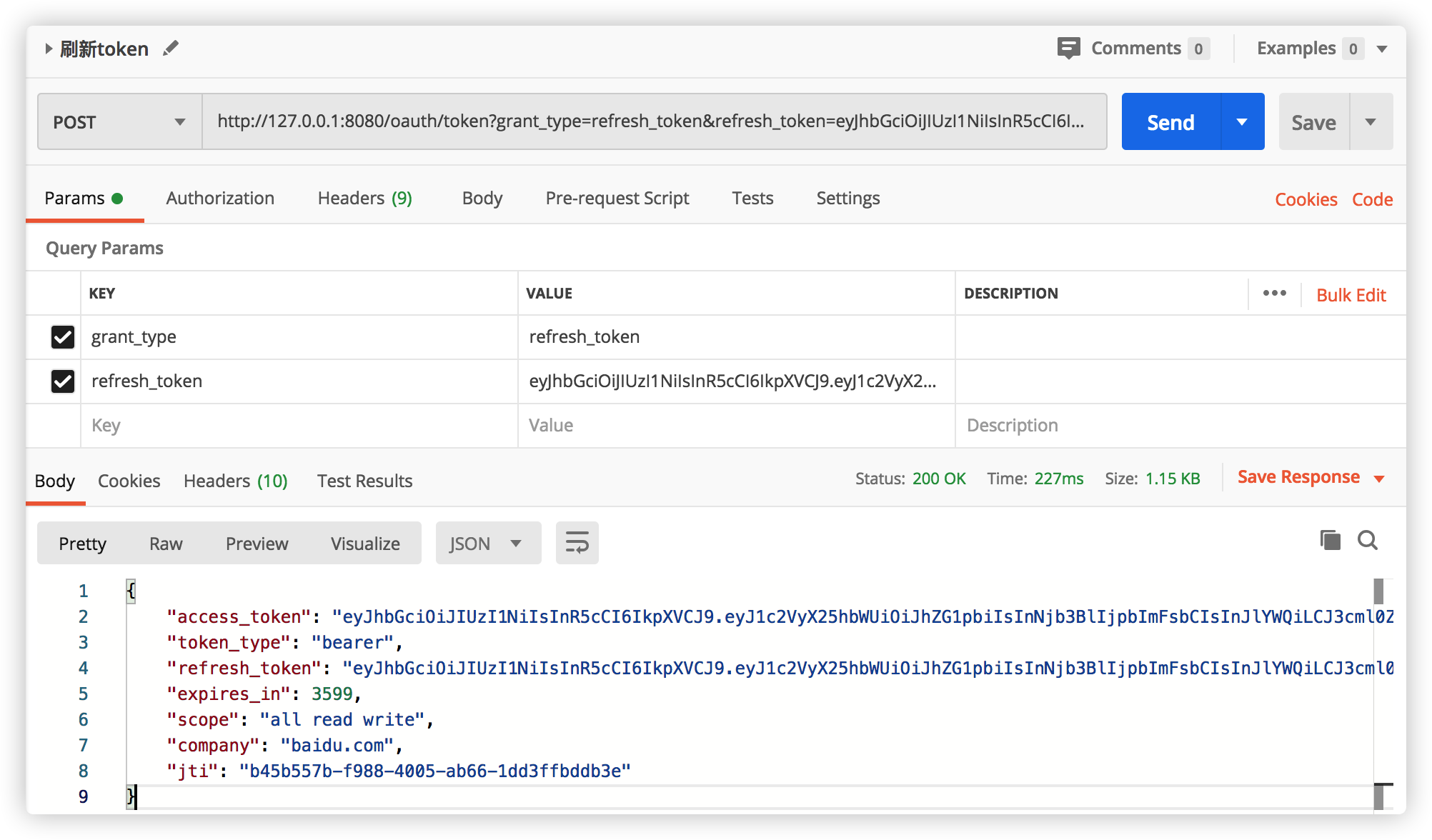 假设现在access_token过期了,我们用refresh_token去换取新的令牌。使用postman发送如下请求: