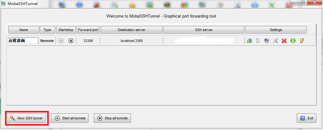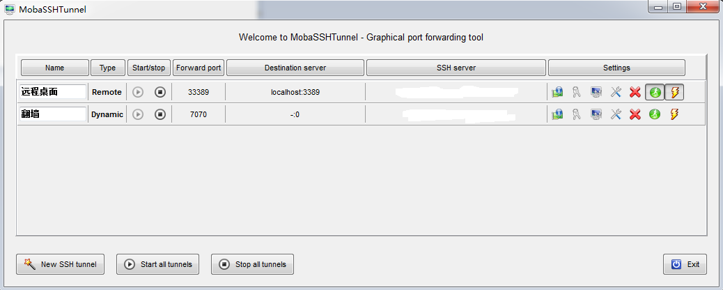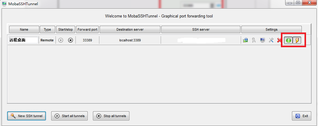 最后在出现的条目中点击最后两个小图标,让它们生效。第一个按钮是此tunnel随MobaXterm启动时自动连接,第二个是当网络意外断开时尝试重新连接。