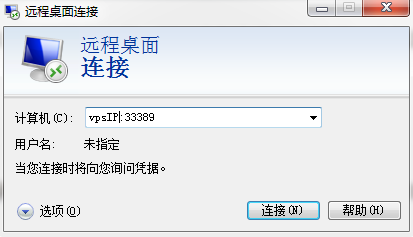 接下来就可以用公司机器直接打开远程桌面,进行连接了。只是连接地址改成vpsIP:33389的样子,如下所示。
