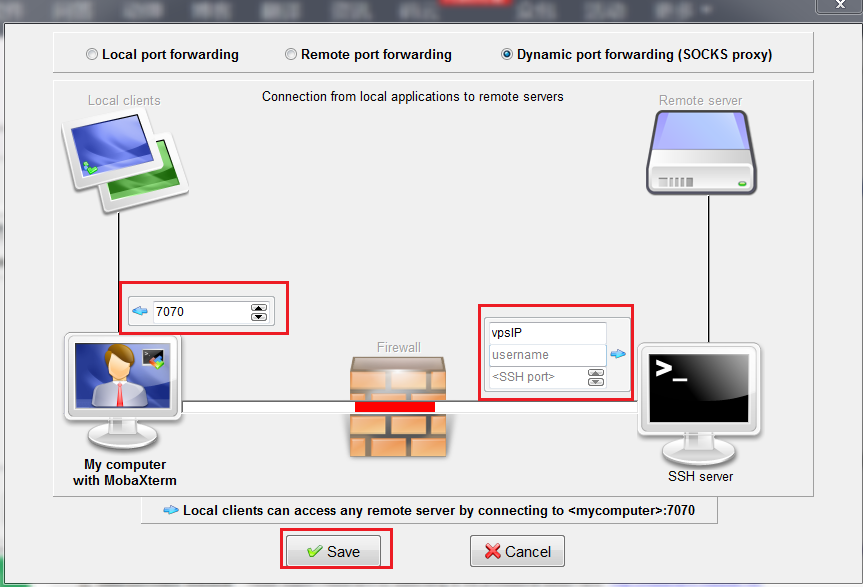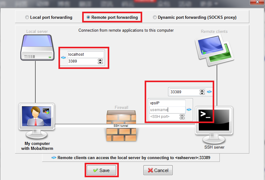 选择Remote port forwarding,填写相应的地址和端口信息后保存