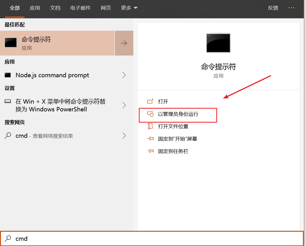 这里教一个小技巧,直接在 windows 搜索栏输入cmd ,直接以管理员身份运行