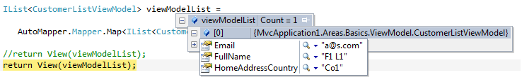 Now, if you see the results below... We have data in Customer class and after doing the AutoMapping CustomerListViewModel class is populated..