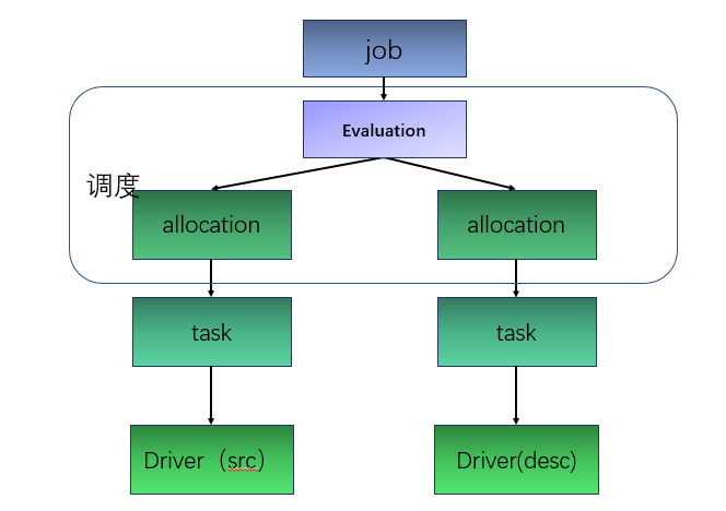如上图所示,在 job 被传入服务器中,为了将 job 中的任务映射到客户端,job 会形成两个 allocation,task,以及 driver,而 job 实现期间的服务器分配,则是通过 evaluation 来实现。
