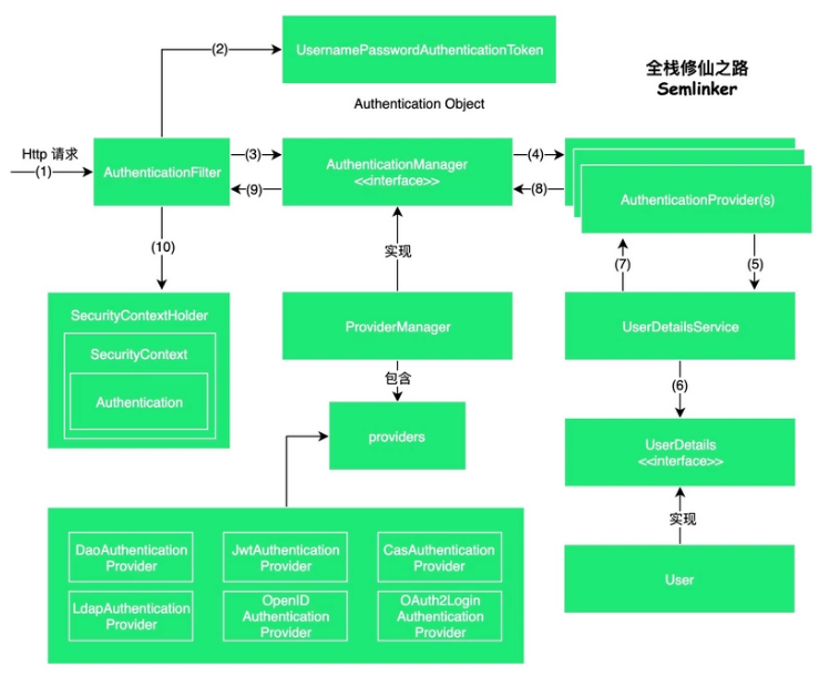 也就是说,Spring Security 中核心的认证入口始终只有一个:AuthenticationManager,不同的认证方式:用户名 + 密码(UsernamePasswordAuthenticationToken),邮箱 + 密码,手机号码 + 密码登录则对应了三个 AuthenticationProvider。