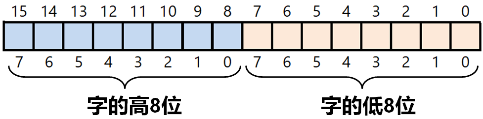 字:两个字节组成,分别为字的高位字节和低位字节
