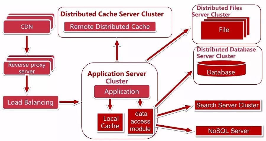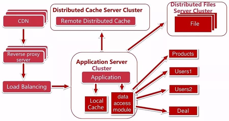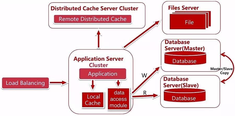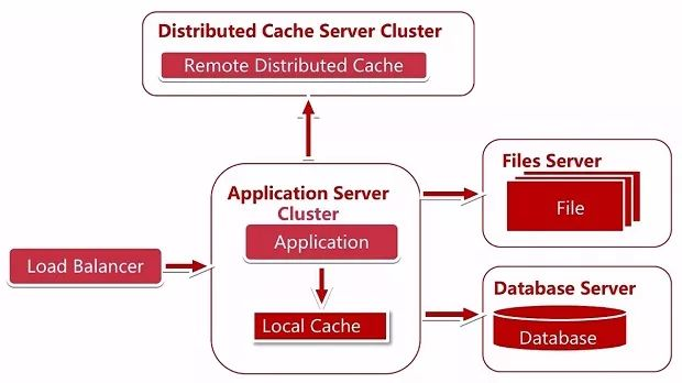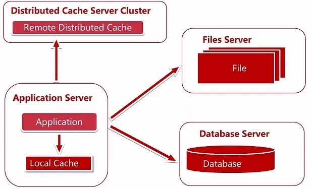 我们发现有很多业务数据不需要每次都从数据库中获取,于是我们使用了缓存,因为 80% 的业务访问都集中在 20% 的数据上 (二八原则),如果能将这部分数据缓存下来,性能就能提高很多,缓存又分两种,一种是 Application 中的本地缓存,还有远程缓存,远程缓存又分为远程的单机式缓存和分布式缓存 (图所示的是分布式缓存集群)。