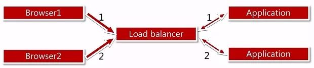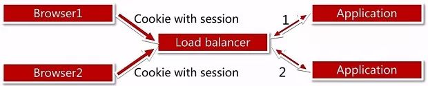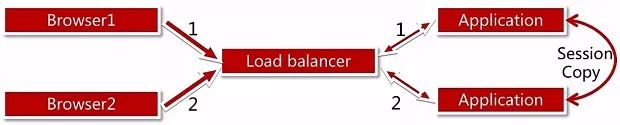 session 复制,即当 browser1 经过负载均衡服务器把 session 存到 application1 中,会同时把 session 复制到 application2 中,所以多台服务器都保存着相同的 session 信息。