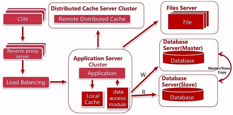 我们可以使用数据库的读写分离,同时应用要接入多数据源。通过统一的数据访问模型进行访问。数据库的读写分离是将所有的写操作引入到主库中 (master),将读操作引入到从库中 (slave),此时应用程序也要做出相应的变化,我们实现了一个数据访问模块 (data accessmodule),使上层写代码的人不知道读写分离的存在,这样多数据源的读写对业务代码就没有侵入,这就是代码层面的演变。