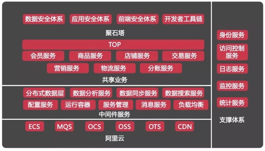 最上面的就是安全体系系统,中间的就是业务运营系统,包含各个不同的业务服务,下面是一些共享服务,然后还有一些中间件,其中 ECS 就是云服务器,MQS 是队列服务,OCS 是缓存等等,右侧是一些支撑体系服务。