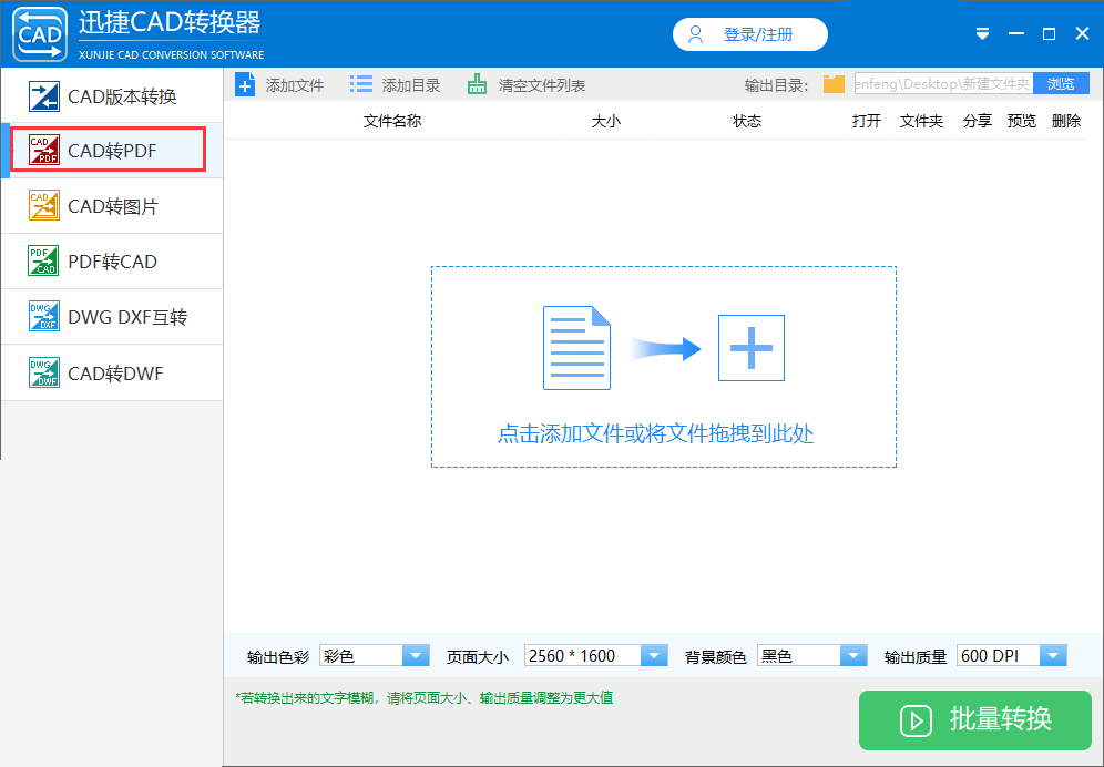 打开cad转换器后发现工具分为导航栏和转换栏两大区域,我们首先需要在左侧的导航栏中选择相应的cad转pdf功能进入到相应的转换界面。
