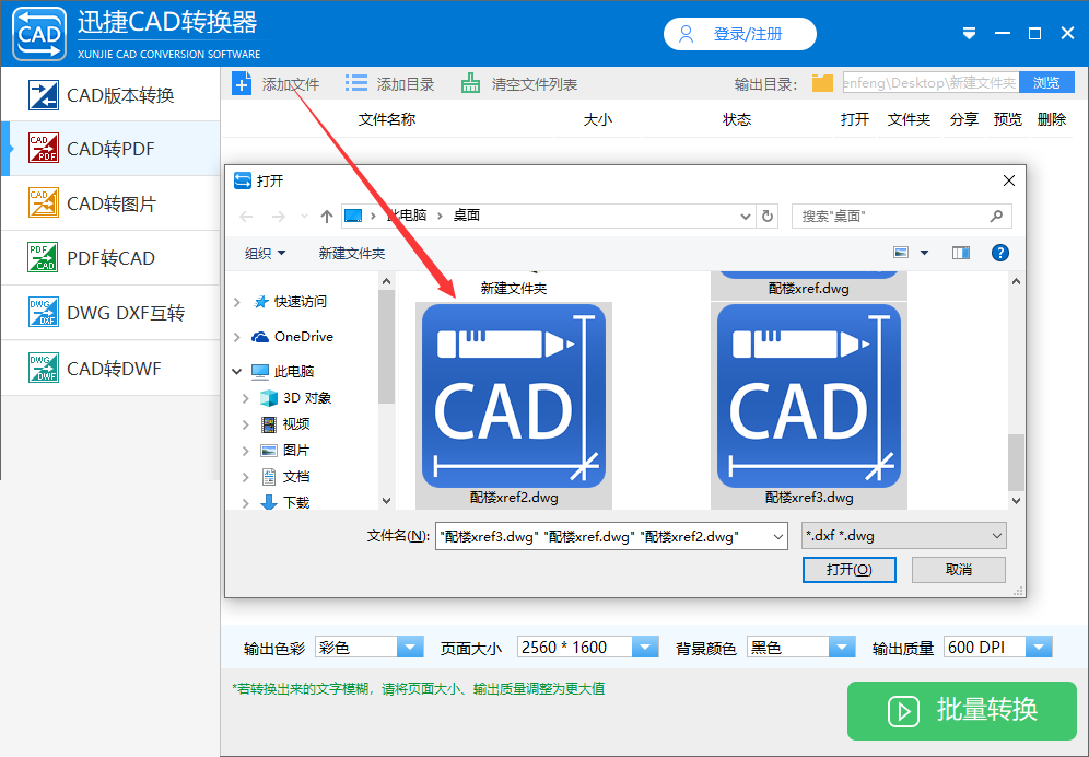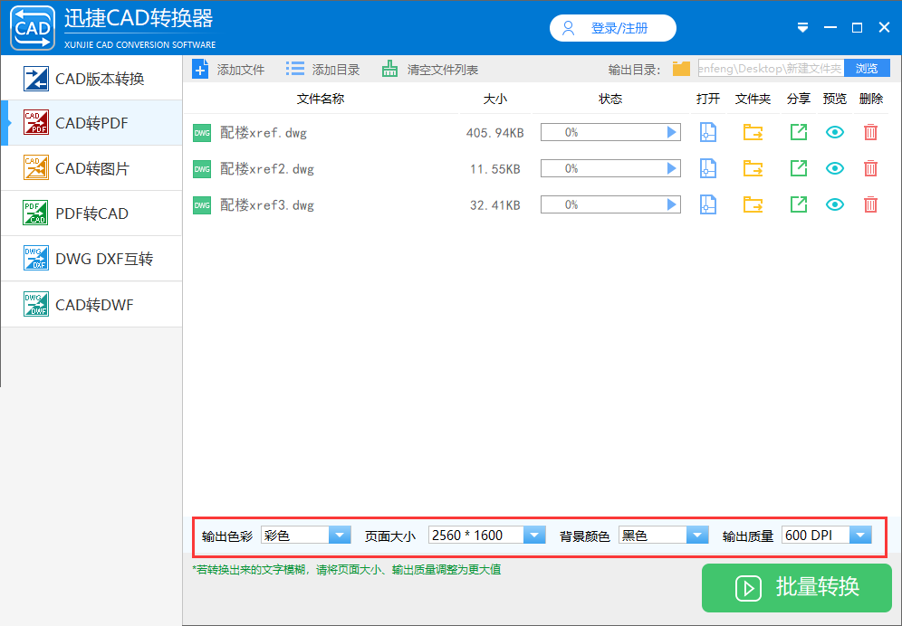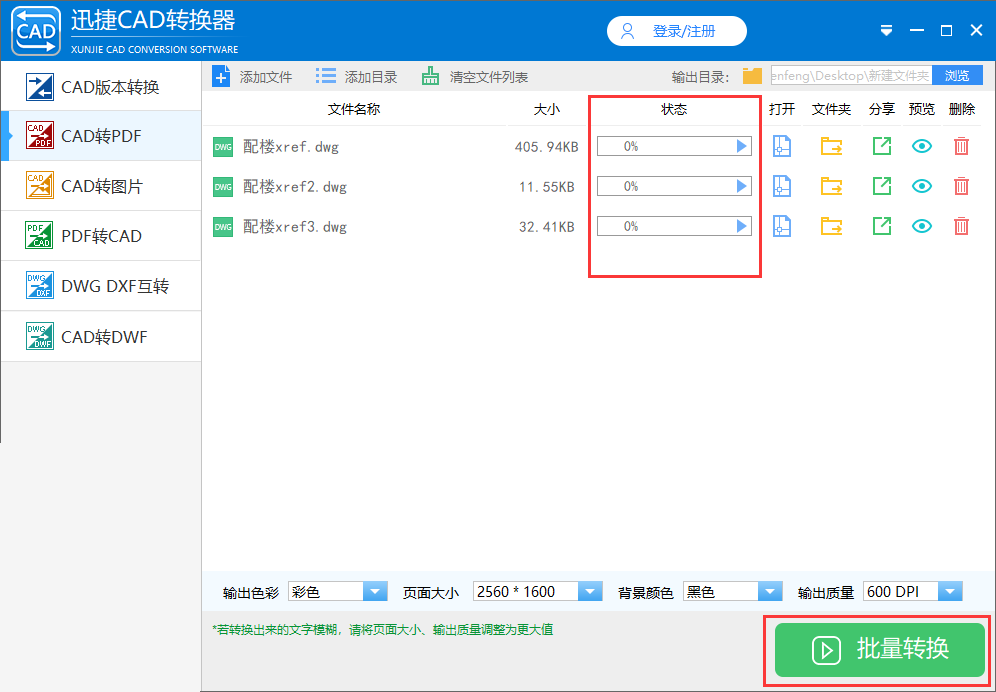 随后逐个点击状态栏的三角图标就可以将添加的cad转换成pdf格式,也可以点击批量转换选项统一将添加好的cad转换成pdf格式。