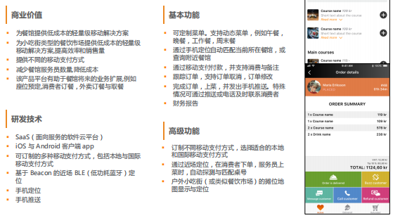 该产品平台有助于餐馆将来的业务扩展,例如座位预定,消费者订餐,外卖订餐与取餐