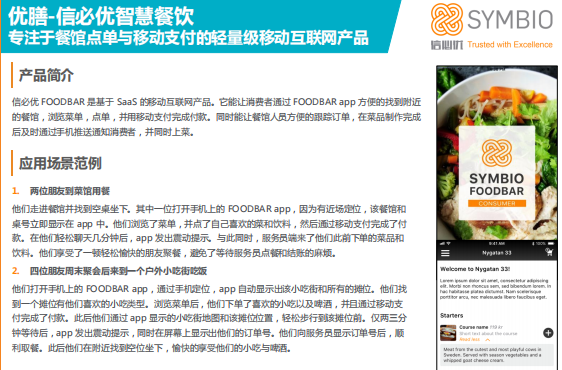 信必优 FOODBAR 是基于 SaaS 的移动互联网产品。它能让消费者通过 FOODBAR app 方便的找到附近的餐馆,浏览菜单,点单,并用移动支付完成付款。同时能让餐馆人员方便的跟踪订单,在菜品制作完成后及时通过手机推送通知消费者,并同时上菜。