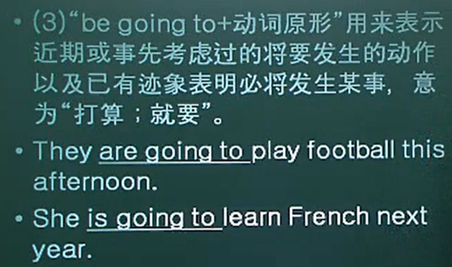 be going to+动词原形 用来表示近期或事先考虑过的将要发生的动作以及有迹象表明必将发生某事,意为 打算;就要