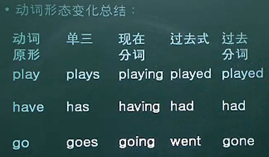 动词形态变化有以下几种:动词原形,单三,现在分词,过去式,过去分词。(过去式和过去分词可能不一样)
