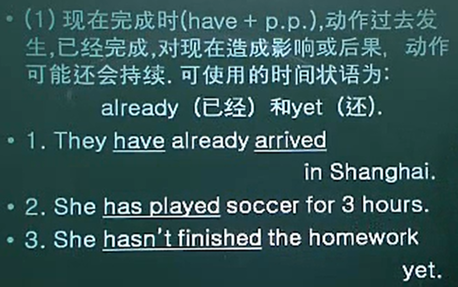现在完成时,have+过去分词,动作过去发生,已经完成,对现在造成影响或后果,动作可能还会持续,可使用的时间状语为:already已经 yet还