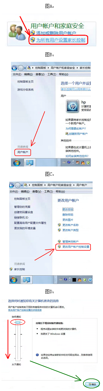 设置方法:电脑左下角点开始=>控制面板=>用户帐户和家庭安全下面的=>(见图A)为所有用户设置家长控制=>(图B)用户帐户=>(图C)更改用户帐户控制设置=>(图D)把滚动条拉到从不通知 点确定,这时候你需要重新启动电脑才能生效。