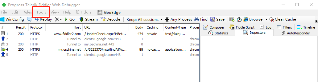 1.打开安装好后的fiddler,点击Tools里面的options进行设置
