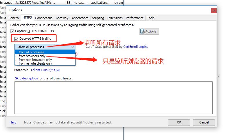 最后重启fiddler,到此设置完毕,现在fiddler就只会监听浏览器的访问!