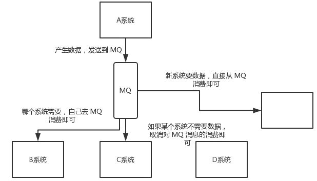 - 系统可用性降低:系统引入外部依赖越多,越容易挂掉。本来A系统调用BCD系统好好的,加一个MQ统一连接BCD系统,万一MQ挂掉,整套系统就崩溃了。见下图所示: