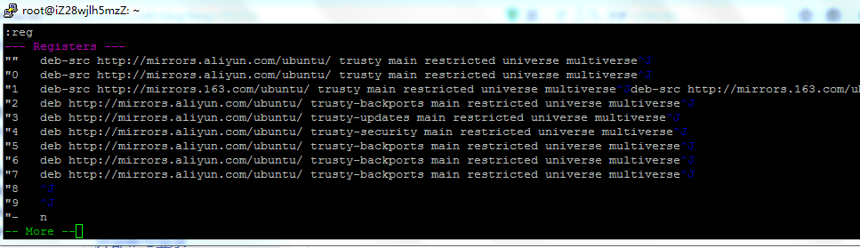 2、+号粘贴板(上面显示是“-)是系统粘贴板,用"+y将内容复制到该粘贴板后可以使用Ctrl+V将其粘贴到其他文档(如firefox、gedit)中,同理,要把在其他地方用Ctrl+C或右键复制的内容复制到vim中,需要在正常模式下按"+p;要将vim某个粘贴板里的内容粘贴进来,需要退出编辑模式,在正常模式按"Np,其中N为粘贴板号,如上所述,可以按"5p将5号粘贴板里的内容粘贴进来,也可以按"+p将系统全局粘贴板里的内容粘贴进来。