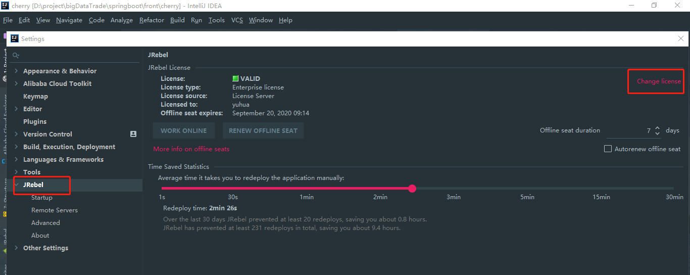 > 3. 在IDEA中点击 File->Settings->JRebel 并找到激活界面