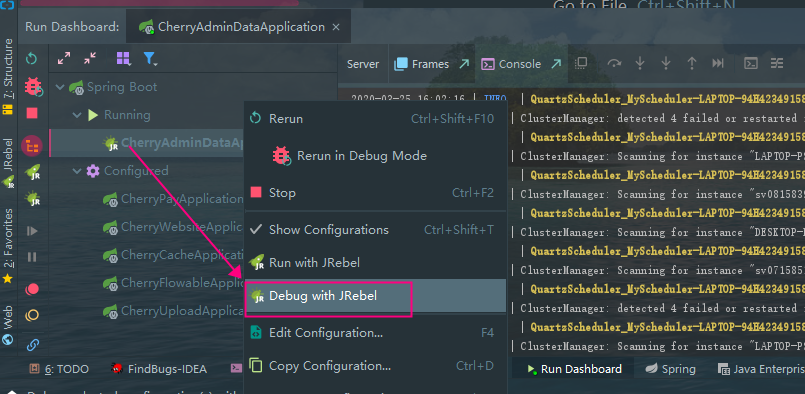OK. 至此,可以打开项目,选择JRebel Debug启动,修改文件后,直接Ctrl+Shift+F9,可以看到已经Reload,可以愉快地开发了。