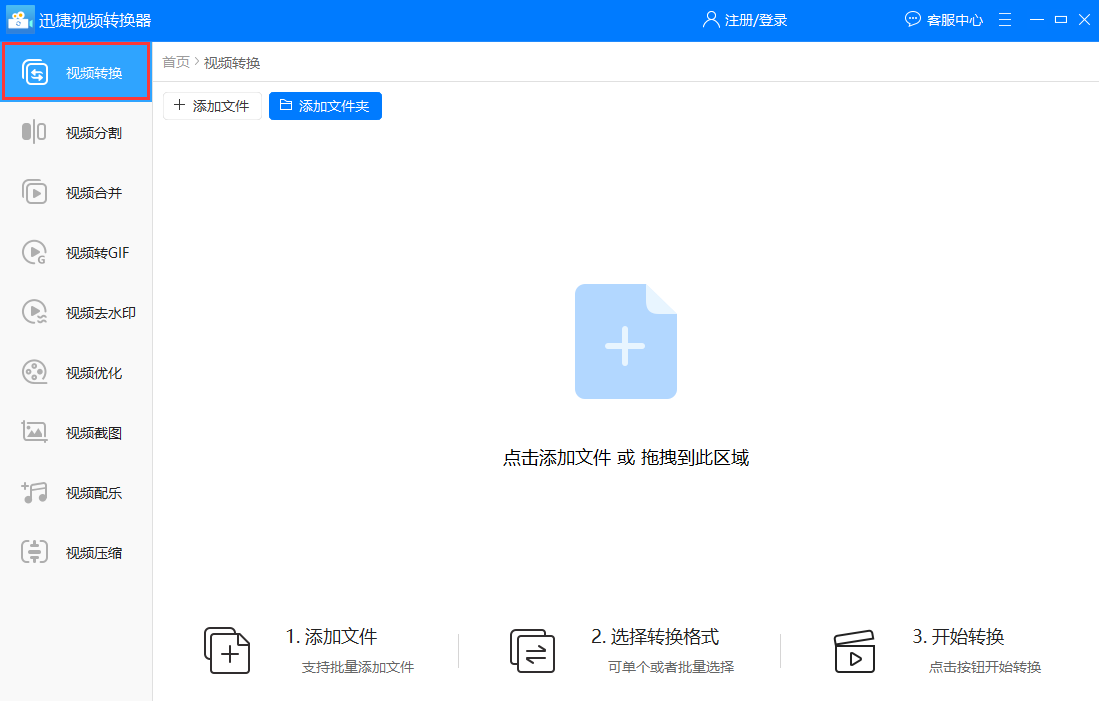 当我们在使用视频转换器时首先需要了解界面,随着小编任意打开一个可以转换视频格式的迅捷视频转换器后发现首页有视频转换、视频合并和视频分割等多种视频编辑方式。